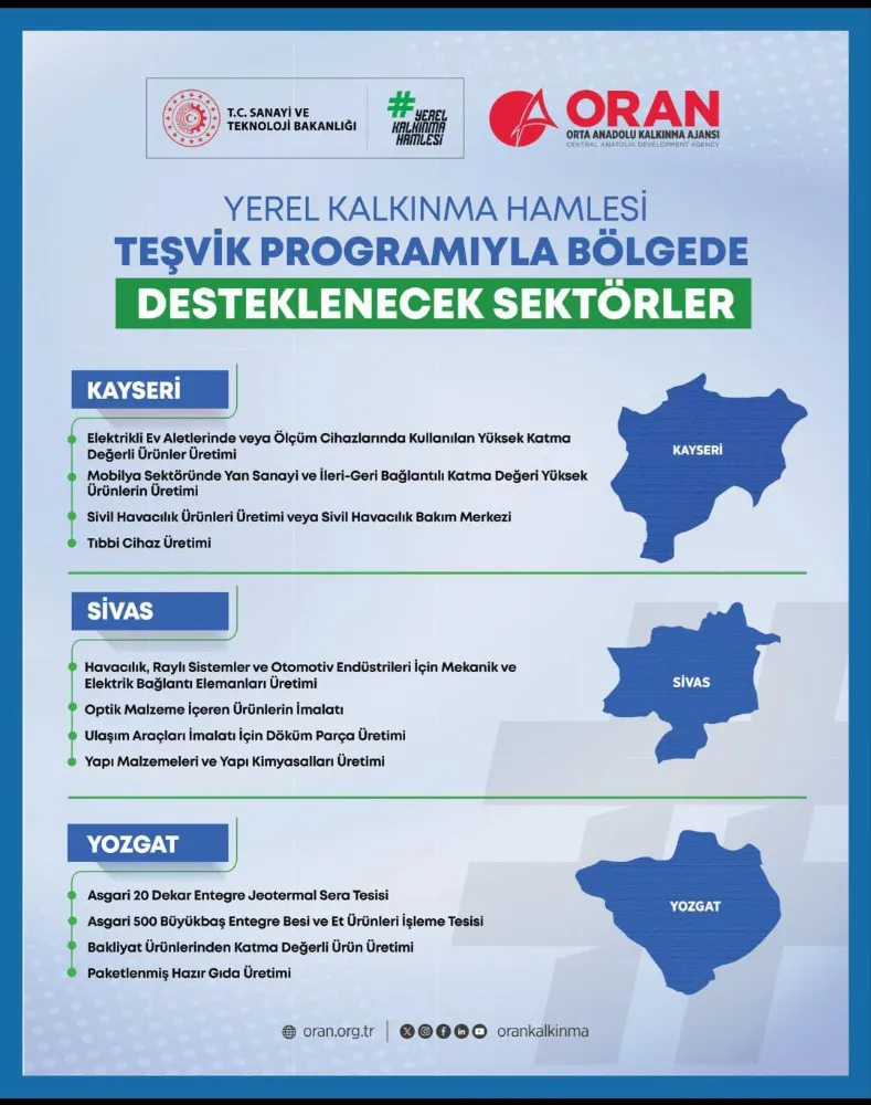 Sanayi ve Teknoloji Bakanlığı öncülüğünde, ORAN Kalkınma Ajansı koordinasyonuyla yürütülen Yerel Kalkınma Hamlesi Teşvik Programı, İç Anadolu’da üretim ve yatırımı hareketlendirecek yeni bir süreci başlattı. Program kapsamında Kayseri, Sivas ve Yozgat için desteklenecek sektörler açıklandı.