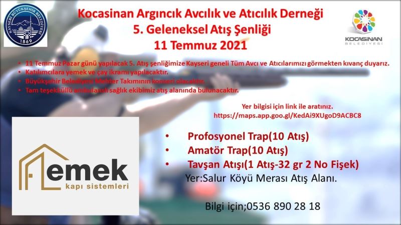 Kocasinan Argıncık Avcılık ve Atıcılık Derneği tarafından geleneksel olarak düzenlenen Atış Şenliği’nin 5.’si Salur Köyü Merası Atış Alanı’nda 11 Temmuz Pazar günü yapılacak.