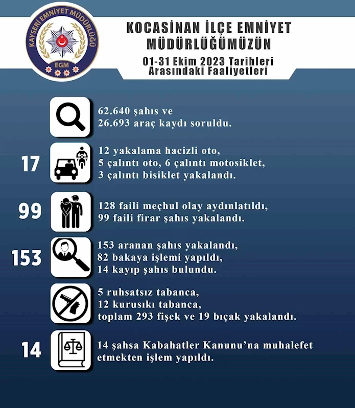Edinilen bilgiye göre Kocasinan İlçe Emniyet Müdürlüğü ekiplerince 1-31 Ekim 2023 tarihleri arasında yapılan çalışmalarda; 62 bin 640 şahıs ve 26 bin 693 araç kaydı soruldu. 12 yakalama hacizli oto, 5 çalıntı oto, 6 çalıntı motosiklet, 3 çalıntı bisiklet yakalandı. Çalışmalar çerçevesinde 128 faili meçhul olay aydınlatılırken 99 faili firar şahıs da yakalandı. Çalışmalarda ayrıca 153 aranan şahıs yakalandı, 82 bakaya işlemi yapıldı, 14 kayıp şahıs bulunarak ailesine teslim edildi.
