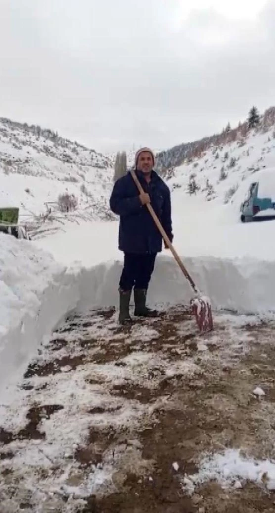 İlçeye bağlı Dereşim Mahallesi’nde besici Fatih Şahin, kar yağışının ardından yolları kapandı. Aracı ve motoru da kar altında kalan Şahin, hayvanlarına yem getirmek için kürekle 500 metre yol açması gerektiğini söyleyerek, belediye yetkililerinden yardım istedi.