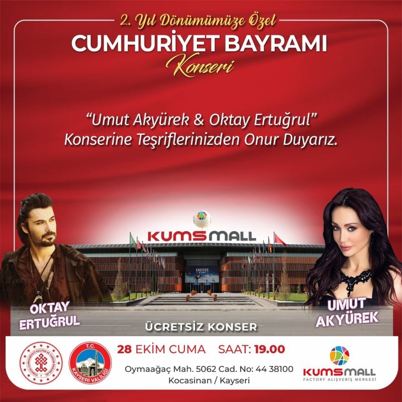 28 Ekim Cuma günü saat 19.00’da gerçekleşecek olan Cumhuriyet Bayramı Konseri’nde sevilen sanatçılar Oktay Ertuğrul ve Umut Akyürek vatandaşlara şarkılarını seslendirecek. Konsere katılımlar ise ücretsiz olacak.