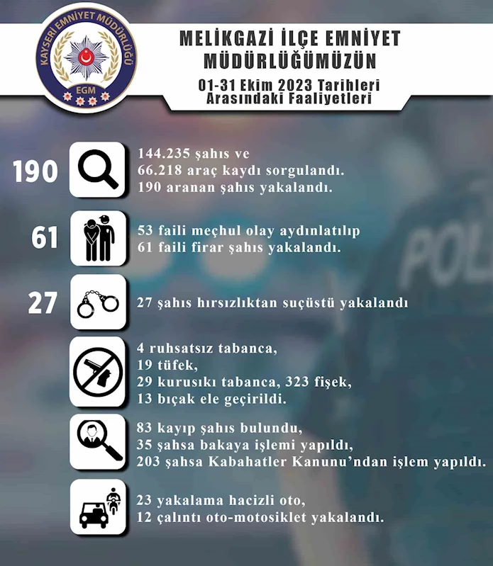 Edinilen bilgiye göre 1-31 Ekim tarihleri arasında yapılan çalışmalarda; 144 bin 235 şahıs ve 66 bin 218 araç kaydı sorgulandı. 190 aranan şahıs, 23 yakalama hacizli oto, 12 çalıntı oto-motosiklet yakalandı. Çalışmalarda 53 faili meçhul olay aydınlatılırken 61 faili firar şahıs da yakalandı. 27 şahıs hırsızlıktan suçundan ekiplerce suçüstü yakalandı. Ayrıca çalışmalarda; 83 kayıp şahıs bulundu, 35 şahsa bakaya işlemi yapıldı, 203 şahsa Kabahatler Kanunu’ndan işlem yapıldı.