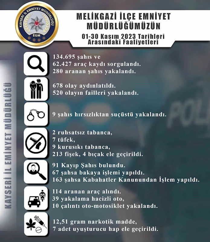 Edinilen bilgiye göre Melikgazi İlçe Emniyet Müdürlüğü ekiplerince 1 - 30 Kasım tarihleri arasında yapılan çalışmalarda 134 bin 695 şahıs ve 62 bin 427 araç kaydı sorgulandı. Sorgulamalar sonucunda 280 aranan şahıs yakalanırken 114 aranan araç alındı, 39 yakalama hacizli oto ile 10 çalıntı oto-motosiklet yakalandı. Ekiplerce 678 olay aydınlatılırken 520 olayın failleri de yakalandı. Yine ekiplerce yapılan çalışmalarda 9 şahıs hırsızlıktan suçüstü yakalandı, 91 kayıp şahıs bulunarak ailesine teslim edildi ve 67 şahsa da bakaya işlemi yapıldı.