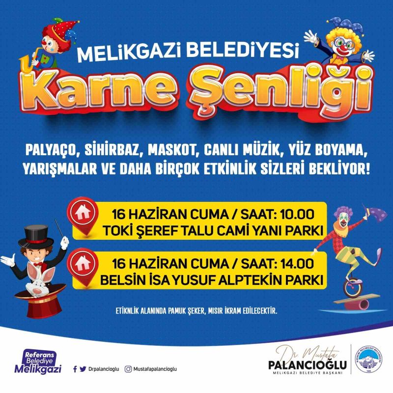 MELİKGAZİ BELEDİYE BAŞKANI DR. MUSTAFA PALANCIOĞLU, 16 HAZİRAN CUMA GÜNÜ İLDEM VE BELSİN BÖLGESİNDE GERÇEKLEŞTİRECEKLERİ KARNE ŞENLİĞİNE TÜM ÇOCUKLARI DAVET ETTİ.