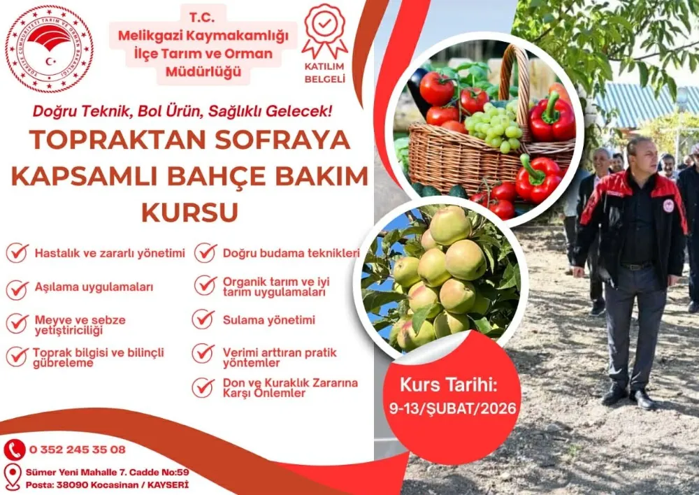 Melikgazi İlçe Tarım ve Orman Müdürlüğü, modern tarımın tüm şifrelerini çözmek ve üreticileri geleceğin tarım teknikleriyle donatmak amacıyla dev bir eğitim hamlesi başlatıyor. “Topraktan Sofraya Kapsamlı Bahçe Bakım Kursu” ismiyle düzenlenen bu program, sadece bir eğitim değil, aynı zamanda daha bereketli bir hasat dönemi için profesyonel bir rehberlik hizmeti sunuyor.