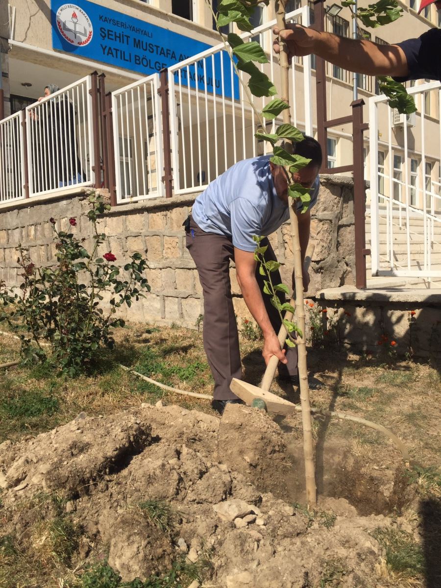 Kayseri'de, Milli Eğitim Bakanı Ziya Selçuk'un çağrısına uyan okul müdürü ve öğretmenler okulun bahçesine fidan dikerek can suyu verdi.