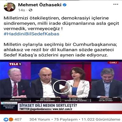 Gazeteci Sedef Kabaş, geçtiğimiz günlerde katıldığı bir televizyon programda Cumhurbaşkanı Recep Tayyip Erdoğan'a yönelik hakaret içeren sözler kullandığı iddiasıyla gözaltına alınmıştı. Gazeteci Sedef Kabaş’ın Cumhurbaşkanı Erdoğan'a yönelik kullandığı sözler üzerine savcılıkta harekete geçerek soruşturma başlattı. RTÜK tarafından da televizyon programın hakkında inceleme başlatıldı. Gazeteci Kabaş, geçtiğimiz gün gece 02.00 sıralarında ‘Cumhurbaşkanına hakaret’ suçundan gözaltına alındı. Olayla ilgili Cumhurbaşkanlığı ve AK Parti yönetiminden peş paşa tepkiler geldi.