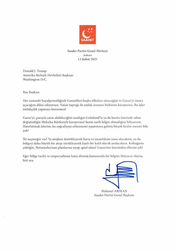 Saadet Partisi Genel Başkanı Mahmut Arıkan, Filistinlileri Gazze’den çıkarma planları yapan ve Gazze’yi cehenneme çevireceğini iddia eden ABD Başkanı Donald Trump’a mektup yazdı.