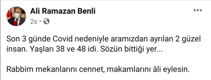 İl Sağlık Müdürü Ali Ramazan Benli, sosyal medya hesabı üzerinden korona virüs nedeniyle hayatını kaybeden 38 ve 48 yaşındaki iki vatandaşın fotoğrafını paylaştı. Paylaşımında "Son 3 günde covid nedeniyle aramızdan ayrılan 2 güzel insan. Yaşları 38 ve 48 idi. Sözün bittiği yer. Rabbim mekanlarını cennet , makamlarını âli eylesin" yazan Benli, korona virüse dikkat çekti.