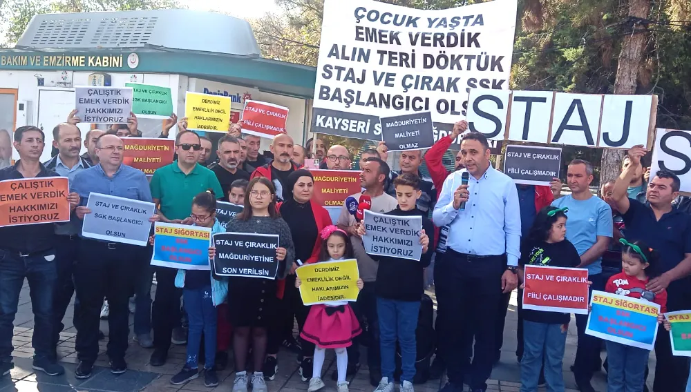 Kayseri Staj ve Çıraklık Sigortası Mağdurları Derneği Sözcüsü Hamide Arslan, şunları söyledi.” 1986’da çıkan 3308 Sayılı Yasanın elimizden aldığı Sosyal Güvenlik kapsamındaki hak kaybımız neticesinde bizler, zorunlu staj ve çıraklık yaparken Sgk tarafından işe giriş tarihli ve Sgk tescil numaralı sigorta kartı verilerek ve “Sigortanız başladı” denilerek aldatılan ve sonrasında bu tarih, gerek Sgk ekranında, gerek Sgk sistemlerindeki verilerde sigorta başlangıcı gösterilerek kandırılmaya devam edilen, akabinde 2000’li yılların başlarında ikinci bir tarih çıkartılarak mağdur bırakılan bir kitleyiz. Dünyanın hiçbir yerinde kısa kol ve uzun kol sigorta ayrımı yoktur. Fiili çalışma var ise, maaş alınmış ise iş hayatı başlamıştır. Dolayısıyla sigortalılık süresi başlamıştır. Sadece ülkemize özgü olan bu sorunun bir an önce çözülerek fiilen çalıştığımız ve sigorta kayıtları ile E-Devlet’de açıkça görünen “ilk işe giriş tarihimiz” emeklilik hesabında hizmete başlangıç tarihi olarak sayılmalıdır. Nasıl ki bir insanın iki farklı doğum tarihi olmazsa, iki adet işe girişi de hukuken olamaz. Ancak maalesef ki ülkemizdeki uygulama şu anda budur. Şöyle bir mevzuat düşünün ki;Yurtdışında aynı staj/çıraklığı aynı şartlarda yapan birisi Türkiye’ye geldiğinde staj ve çırak başlangıç tarihini işe giriş olarak saydırabiliyor ve bizler gibi mağdur olmadan hakkı olanı rahatlıkla alabiliyor. Oysa bizler de aynı şekilde fiili olarak çalıştık, maaş aldık, iş akdimiz oluşmuştu ama maalesef biz hakkımız olanı alamıyoruz.Aynı bu konu gibi bir de kadın doğum borçlanmasındaki haksızlık var. Bilindiği gibi kadın doğum borçlanması yapabilmek için doğumdan önce işe giriş olması gerekiyor. Ancak öyle bir mevzuat düşünün ki; normalde işe giriş olarak kabul edilmeyen staj/çıraklık girişi, konu kadın doğum borçlanması olduğunda ne hikmetse işe giriş kabul ediliyor ve doğum borçlanmasına izin veriliyor. Böyle haksızlıkların olduğu yılların mağdurları olarak biz artık bu mağduriyetin bitmesini istiyoruz. Mağduriyetimizin çözümü adına gerek sahalarda, gerek siyasi görüşmelerimizle, gerekse sosyal medya çalışmalarımızla mücadelemiz devam etmektedir. Çalışmalarımızın başka bir bölümünü de basın açıklamalarımız oluşturmaktadır.