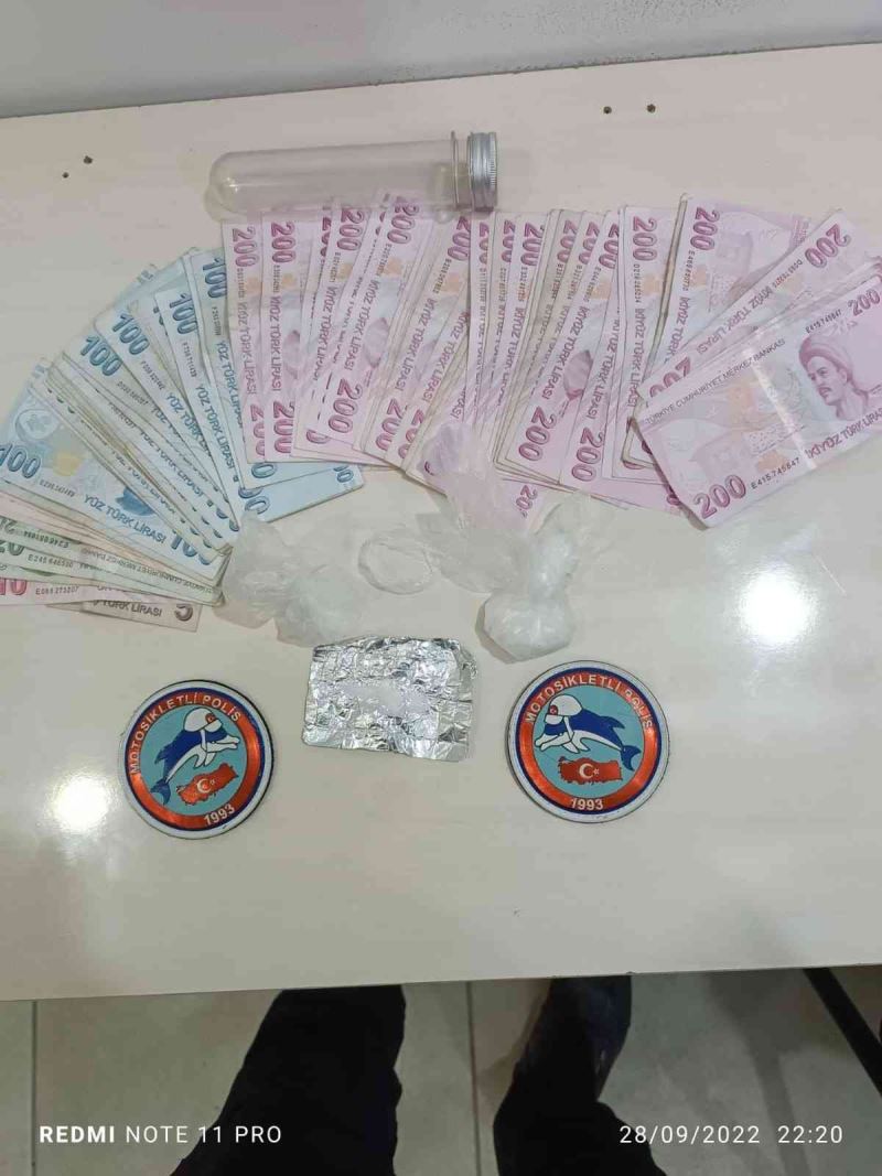 Kayseri İl Emniyet Müdürlüğü Asayiş Şube Müdürlüğü’ne bağlı Motosikletli Polis Timleri Büro Amirliği ekipleri tarafından Kocasinan ilçesinde yapılan çalışmalarda, durumundan şüphelenilen E.A. durdurularak kontrolü yapıldı. Şahsın yapılan üst aramasında 3 parça halinde uyuşturucu madde ve 9 bin 730 TL para bulundu.