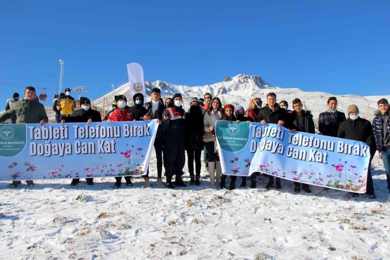 Kayseri İl Sağlık Müdürlüğü Halk Sağlığı Hizmetleri Başkanı Dr. Ahmet Özyalçın, “11.11.2021’de ‘Geleceğe nefes, dünyaya nefes’ temasıyla bugün Erciyes Dağı’nın eteklerindeyiz. Fidan dikme etkinliğine katıldık. Bizde Sağlık Bakanlığı olarak ‘tableti telefonu bırak, doğaya can kat’ diyoruz. Pandemi dolayısıyla eve kapandık. Evde geçirdiğimiz süre arttı. Buna bağlı olarak da gerek çocuklarımızda gerekse gençlerimizde dijital bağımlılık gelişti. Bundan kurtulmanın çeşitli yolları var. bizimde bu şekilde hareket etmemiz dolayısıyla etrafımızdaki hem çocukları korumak hem de gençlerimizi korumak anlamında bir farkındalık oluşturmamız gerekiyor" diye konuştu.