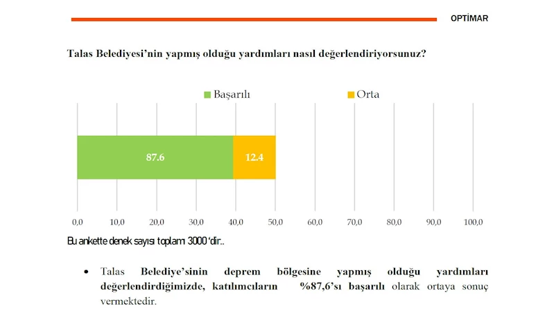 Öte yandan ankette yer alan “Talas Belediyesi’nin deprem bölgesine yaptığı yardımları nasıl buluyorsunuz?” sorusuna katılımcıların yüzde 87,6’sı başarılı bulduğunu söyledi.
