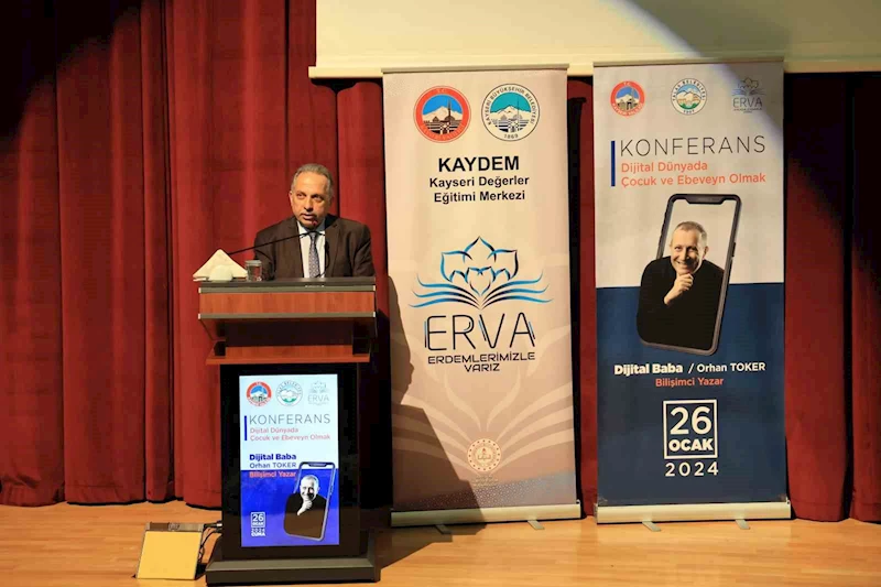 KAYÜ Rektörü Prof. Dr. Kurtuluş Karamustafa ise, Türkiye’de üniversitelerin artık halkla bütünleşen, kapılarının topluma açık olduğu mekanlar haline geldiğini kaydederek; "Özellikle Talas Belediye Başkanımıza çok teşekkür ediyorum. Talas Belediyesi ile güzel çalışmalar yapıyoruz. Gerek mekânsal gerekse akademik işbirliği çalışmaları yapılıyor.” diye konuştu. Kayseri Vali Yardımcısı Ömer Tekeş, dijital dünyada çocuk ve ebeveyn olmak konusunun çok önemli olduğunu dile getirerek, konuğun da çok önemli olduğunu söyledi. Tekeş, ERVA projesi hakkında bilgiler vererek, “16 ilçede 100 okulda 40 binden fazla öğrencimize değerler eğitimi veriyoruz. Üçüncü ayımızdayız. Her ayın sonunda bir aile semineri düzenliyoruz. Bunun yanında spor okullarımız da var. Her mahallede bir spor okulu şeklinde yola çıktık. Şu ana kadar 18 spor okulu açtık. Amacımız temel değerlerimizi eğitimlerle gençlerimize ve çocuklarımıza vermeye çalışmak. ERVA şu anda Türkiye’ye örnek bir projedir.” şeklinde konuştu. Konuşmaların ardından Dijital Baba olarak bilişimci yazar Orhan Toker, sahneye çıkarak söyleşisini gerçekleştirdi. Toker, yaklaşık bir saat süren söyleşide çocukları teknolojik cihazlarla baş başa bırakmamanın, ebeveynlerle birlikte o cihazları izlemenin önemine örneklerle dikkat çeken tavsiyelerde bulundu. Program Talas Belediye Başkanı Mustafa Yalçın ve Vali Yardımcısı Ömer Tekeş, bilişimci yazar Orhan Toker’e çiçek ve plaket takdim etmesiyle tamamlandı.