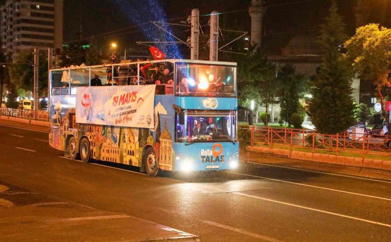 Talas Belediyesi’nin pandemiyle birlikte geleneksel hale getirdiği üstü açık gezi otobüsüyle kutlama etkinliği, 19 Mayıs Atatürk’ü Anma Gençlik ve Spor Bayramı’nda da devam etti.