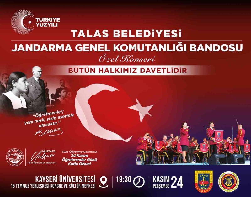 Kültür ve sanat alanındaki faaliyetleriyle dikkat çeken Talas Belediyesi, yine farklı bir etkinliğe imza atıyor. Talas Belediye Başkanı Mustafa Yalçın’ın özel davetiyle şehre gelecek Jandarma Genel Komutanlığı Bandosu, Kayserililere unutulmaz bir gece yaşatacak. Birbirinden özel konserlerle şimdiye kadar birçok farklı şehirde konser vererek dinleyicilerin milli ve manevi duygularını kabartan Jandarma Genel Komutanlığı Bandosu, bu kez 24 Kasım Perşembe günü Talas’ta sahne alacak.