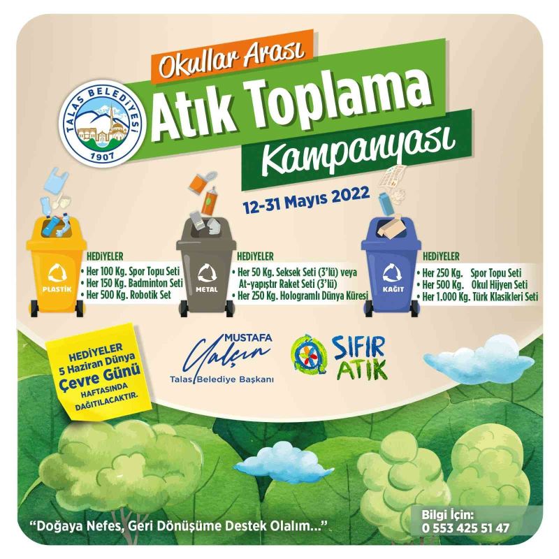 Talas Belediyesi tarafından ’Doğaya Nefes, Geri Dönüşüme Destek Olalım’ sloganıyla okullar arası atık toplama kampanyası başlatıldı.