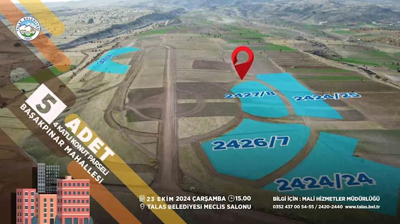 Talas Belediyesi kaçırılmayacak yatırım fırsatları sunmaya devam ediyor. Toplam 8 parça taşınmazdan ilk olarak mülkiyeti Talas Belediyesi’ne ait Başakpınar Mahallesi’nde bulunan çeşitli büyüklüklerdeki 5 konut parselinin satışı yapılacak. Kapalı teklif yoluyla yapılacak ihalelerde Malatya yolu üzerinde bulunan arsalar alıcısını bulacak.