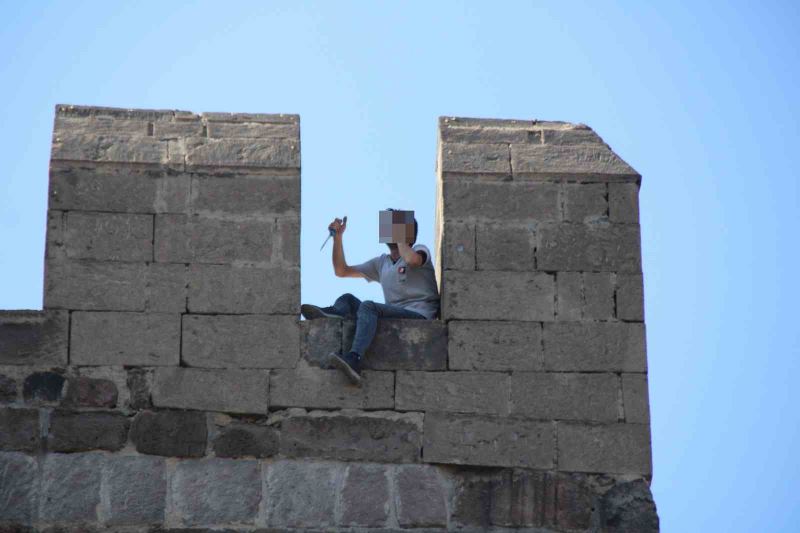 Edinilen bilgiye göre Cumhuriyet Mahallesi’nde bulunan tarihi Kayseri Kalesi surlarında bir kişinin olduğunu gören vatandaşlar, durumu yetkililere bildirdi. İhbarın ardından bölgeye çok sayıda polis, sağlık ve ambulans ekibi sevk edildi. Polis çevrede güvenlik önlemi alırken, itfaiye ekipleri ise zemine branda açtı. Elinde bıçak olan şahıs zaman zaman korku dolu anlar yaşatırken, meraklı vatandaşlar ise cep telefonlarıyla şahsı görüntülemek için birbiriyle yarıştı. İsminin Y.A. olduğu öğrenilen şahıs, polis ekiplerinin uzun uğraşları sonucu ikna edilerek aşağı indirildi.