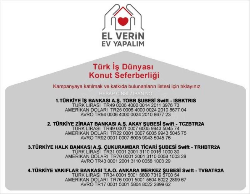 “Odalarımızla, borsalarımızla, sektör meclislerimizle, kadın ve genç girişimci kurullarımızla, yani camiamızın tamamıyla da, kampanyaya dahil oluyoruz. Onlar, 81 il ve 160 ilçede, bu işin önderliğini üstlenecek ve yerele yayılmasını sağlayacaklar. Ve şimdi buradan tüm iş dünyamızı ve hayırsever vatandaşlarımızı da, bu seferberliğe davet ediyoruz. Unutmayalım ki, bizler el ele verdiğimizde, aşamayacağımız zorluk yoktur. Gün, bir olma, beraber olma, kenetlenme günüdür. Gün Birlik Olma Günü’dür. Siz de gelin, ister bir blok, ister bir daire, ister bir tuğla karşılığı bağışta bulunun. Dayanışma ruhumuz ölümsüzleşsin. Millet olduğumuzu gösterelim. Şehirlerimizi tekrar ayağa kaldırmak için destek verelim. Kampanya sloganımızda da ifade ettiğimiz gibi; gelin hep birlikte el Verin ev Yapalım. Vereceğini destekle, depremzedelerin yarınlarına umut olalım.”