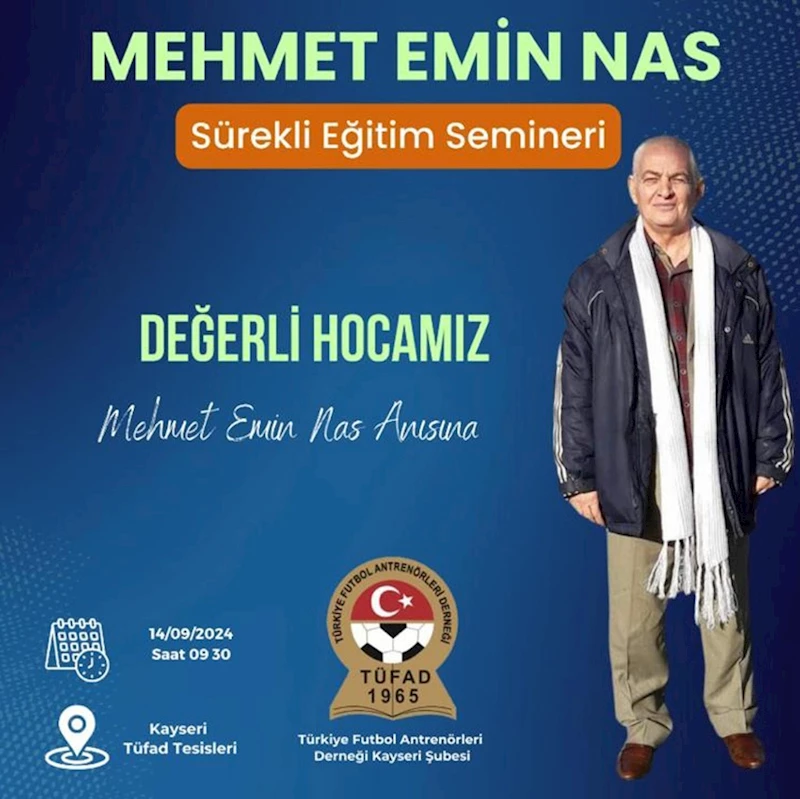 TFF ve TÜFAD tarafından seminer geçtiğimiz aylarda hayatını kaybeden TÜFAD Kayseri Şube Başkanlarından Mehmet Emin Nas adına düzenlenecek. TÜFAD Kayseri Şubesi Eğitim Komisyonu tarafından hazırlanan Sürekli Eğitim Semineri 14 Eylül Cumartesi günü online olarak gerçekleştirilecek. TFF C ve Pro Lisans dışındaki bütün antrenörlerin katılması zorunlu olan bu seminere katılmayan antrenörler 2025-2026 sezonu için sözleşme imzalama hakkını kaybedecek ve hiçbir takım ile sözleşmeli çalışamayacak.