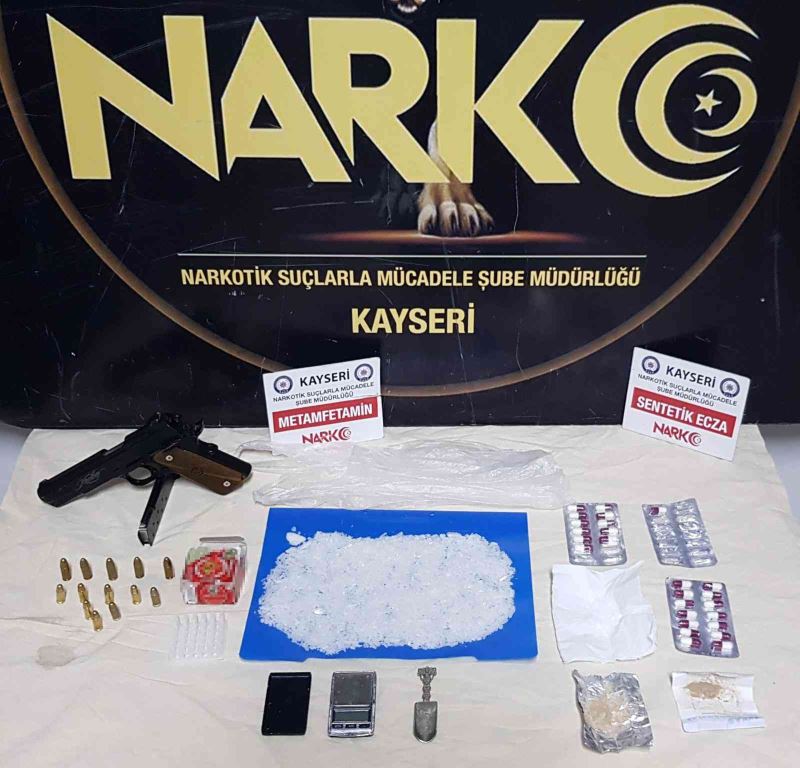 Edinilen bilgiye göre, Kayseri İl Emniyet Müdürlüğü Narkotik Suçlarla Mücadele Şube Müdürlüğü ekipleri, E.T.’nin araç ile uyuşturucu madde ticareti yaptığı bilgisi üzerine harekete geçti. Aracı tespit eden ekipler, durdurmak istedi. İhtara uymayarak kaçan araç durdurulurken, içerdeki 2 kişi kapıyı açmadı. Narkotik polisleri aracın camını kırarak şahısları yakaladı. Araçta yapılan aramada ise, çeşitli miktarlarda uyuşturucu madde, 1 adet hassas terazi, 26 adet sentetik hap, 1 adet uyuşturucu tartımında kullanılan ölçek kaşık, 1 adet ruhsatsız tabanca ve 13 adet fişek ele geçirildi. Olayla ilgili 2 şüpheli şahsa işlem yapılırken, E.T. ’uyuşturucu madde ticareti yapmak’ suçundan gözaltına alındı.
