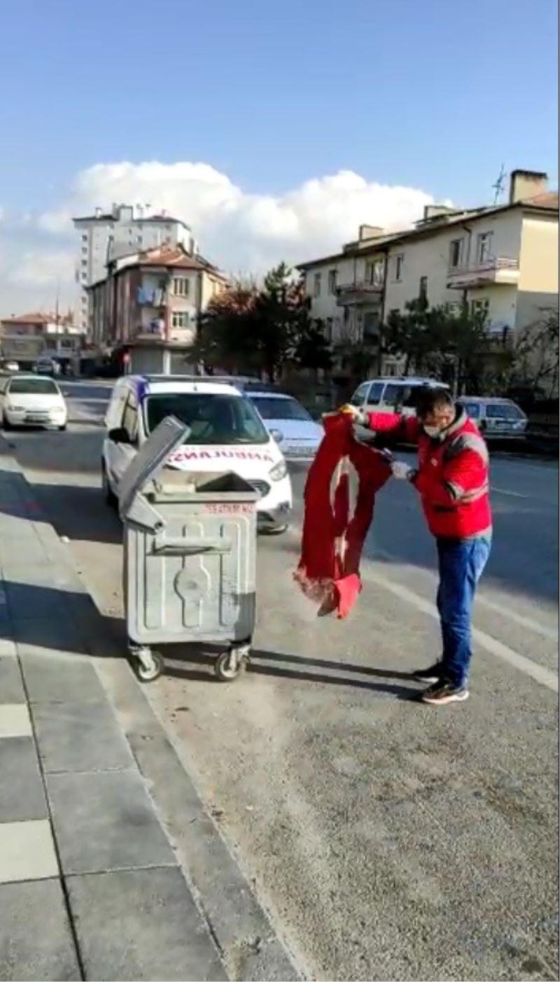 Kayseri’de bir belediye çalışanı çöpte bulduğu ay-yıldızlı bayrağı temizledikten sonra aracında muhafaza altına aldı.