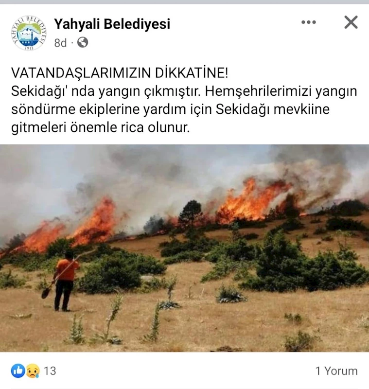 Edinilen bilgiye göre ilçede bulunan Sekidağı’nda öğle saatlerinde yangın çıktı. Çıkan yangının büyümemesi için Yahyalı Belediyesi tarafından da sosyal medya hesabından vatandaşlardan bölgeye giderek söndürme çalışmalarına katkıda bulunması istendi.