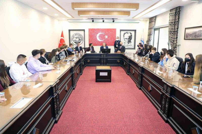 Başkan Yalçın, Avrupa Birliği desteğinde Erciyes Koleji Erasmus Ekoloji Projesi kapsamında Romanya, İspanya, Yunanistan ve Portekiz’den Talas’ı ziyarete gelen öğretmen ve öğrencileri belediyede misafir etti.