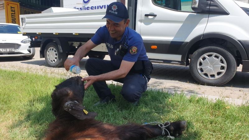 Kayseri’nin Melikgazi ilçesinde sahibinden kaçarken otomobil çarpması sonucu yaralanan kurbanlık keçiye, polis ekipleri elleriyle su içirdi.