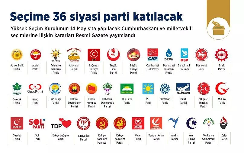 Alfabetik sırayla bu partiler şöyle: Adalet Birlik Partisi, Adalet Partisi, Adalet ve Kalkınma Partisi, Anadolu Birliği Partisi, Anavatan Partisi, Aydınlık Demokrasi Partisi, Bağımsız Türkiye Partisi, Büyük Birlik Partisi, Büyük Türkiye Partisi, Cumhuriyet Halk Partisi, Demokrasi ve Atılım Partisi, Demokratik Sol Parti Demokrat Parti, Emek Partisi, Gelecek Partisi, Genç Parti, Güç Birliği Partisi, Hak ve Özgürlükler PartisiHalkın Kurtuluşu Partisi, Halkların Eşitlik ve Demokrasi Partisi Hür Dava Partisi, İYİ Parti, Memleket Partisi, Millet Partisi, Milliyetçi Hareket Partisi, Milli Yol Partisi, Saadet Partisi, Sol Parti, Türkiye İşçi Partisi, Türkiye Komünist Hareketi, Türkiye Komünist Partisi, Vatan Partisi, Yeniden Refah Partisi, Yenilik Partisi, Yeni Türkiye Partisi, Zafer Partisi. Haber Merkezi