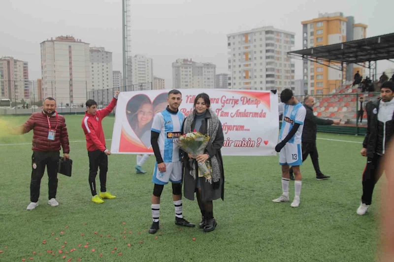 Sarız Anadoluspor’un savunma oyuncusu Harun Gültekin, Amaratspor karşılaşması öncesi takım arkadaşları ve taraftarların tezahüratları eşliğinde kız arkadaşına evlilik teklifi yaptı.