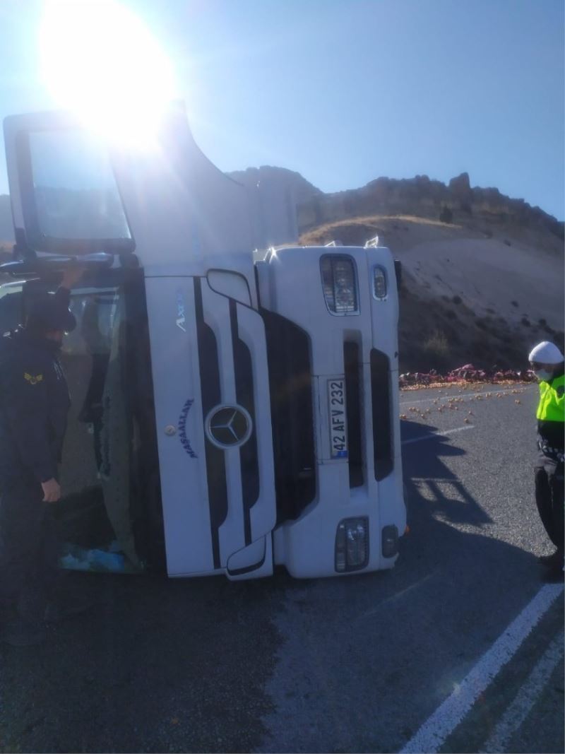 Yeşilhisar ilçesinde direksiyon hakimiyeti kaybolan kamyon yan yattı. Kazada, kamyonun dorsesinde bulunan tonlarca mandalina yola saçıldı.