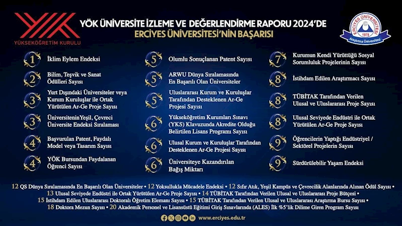 Erciyes Üniversitesi 9 göstergede ilk 5’te, 18 göstergede ilk 10’da, 27 göstergede ise ilk 20’de yer alarak büyük bir başarı elde etti. Ayrıca, yayınlanan rapora göre “İklim Eylem Endeksi” göstergesinde Türkiye birincisi olarak yer aldı.