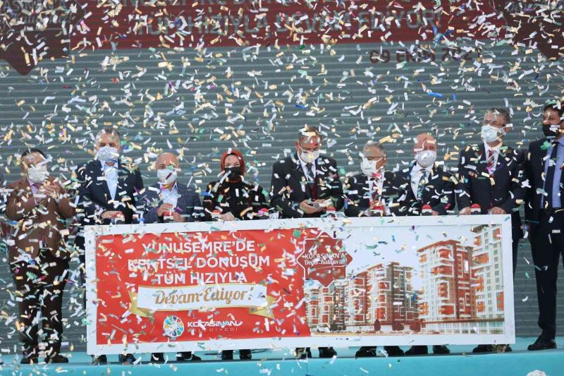 Belediye Başkanı Ahmet Çolakbayrakdar’ın ev sahipliğinde, Yunusemre Mahallesi’nde düzenlenen programa; AK Parti Genel Başkan Yardımcısı ve KAyseri Milletvekili Mehmet Özhaseki, AK Parti Kayseri Milletvekilleri Hülya Nergis Atçı ve İsmail Tamer, Büyükşehir Belediye Başkanı Memduh Büyükkılıç, AK Parti İl Başkanı Şaban Çopuroğlu, AK Parti Kocasinan İlçe Başkanı Hüseyin Okandan, kamu kurum ve kuruluşların temsilcileri, belediye meclis üyeleri, bölge sakinleri ve davetliler katıldı. Kocasinan Belediyesi olarak kentsel dönüşüm çalışmalarının hızlı bir şekilde devam ettiğini ve dönüşümle birlikte sosyal dönüşümü de aynı anda gerçekleştirdiklerini ifade eden Başkan Çolakbayrakdar, “Özellikle kentsel dönüşüm kanunu çıkartarak, belediyelerin işlerini kolaylaştıran Cumhurbaşkanımız Sayın Recep Tayyip Erdoğan’a teşekkür ediyor, şükranlarımı sunuyorum. Çıkarılmış olan kanunla birlikte daha hızlı bir şekilde dönüşüm projeleri gerçekleştiriyoruz. Kayseri’yi iyi tanıyan, ihtiyaçlarını iyi bilen birisi olarak yapılan bu çalışmaların her birinde Önceki Dönem Çevre ve Şehircilik Bakanımız Sayın Mehmet Özhaseki’ nin destekleri ve katkıları var. Bundan dolayı Bakanımız Sayın Mehmet Özhaseki’ ye teşekkür ediyorum. Kentsel dönüşüm kanunu bizim için bir fırsattır. Bu çerçevede hemşehrilerimin rızasını alarak, dönüşümü gerçekleştiriyoruz” diye konuştu. Kentsel dönüşüm projelerinin hayata geçirilmesinin sabır isteyen zor bir süreç olduğunu belirten Başkan Çolakbayrakdar, Kayseri’ye ve Kocasinan’a hizmet veren belediye başkanlarına teşekkür ederek, “Belediye başkanlarımızdan almış olduğumuz mirasın üstüne ekleyerek, bayrağı daha yukarılara taşıyıp, gelecek nesillere aktarmak için çalışıyoruz. Devam eden dönüşümle bu bölgede 6 blok halinde 336 dairemizin anahtarı ve tapusunu hak sahiplerine teslim ettik. Şimdi ise 6 bloktan oluşan ve her biri ikişer blok olan toplam 12 bloğun çalışmalarına başladık. Her bir blok 104 daireden oluşmaktadır. İlk etapta 227 tane imarsız yapıdan oluşan yaklaşık 500 hak sahibiyle tek tek yıllarca anlaşarak bugünlere geldik. Vatandaşlarımızın rızasını alarak, dönüşüm gerçekleştirdik. Geldiğimiz noktada hemşehrilerimizin memnuniyeti var. Birçoğunun söylediği; ’40 yıldır beklediğimiz hayallerimizi gerçekleştirdiniz’ yorumları var. Dönüşümle birlikte sosyal dönüşüm gerçekleştirdik. Buraya çevre düzenlemenin yanı sıra büyük bir park ve Kocasinan Akademi’nin havuzlu sosyal tesisini yapacağız. Diğer mahallelerimizde devam eden dönüşümle bölgenin ihtiyaçlarını teker teker çözüp, hayata geçiriyoruz. Dönüşümle birlikte geleceğimizin teminatı evlatlarımız, yeni ve konforlu bir şehirde yaşayabileceği alanları sunacağız. Gayretimiz, çocuklarımıza, daha güzel bir gelecek sağlayabilmek içindir” ifadelerine yer verdi. Başkan Çolakbayrakdar, Kayseri’ye daha iyi bir şekilde hizmet edebilmenin gayreti içinde olduklarını belirterek, “Biz, şehrimizi ve vatandaşlarımızı seviyoruz. Bu şehre sevdalı ve bu milleti seven ekip ruhuyla çalışmalarımıza devam edeceğiz.” diyerek noktaladı.